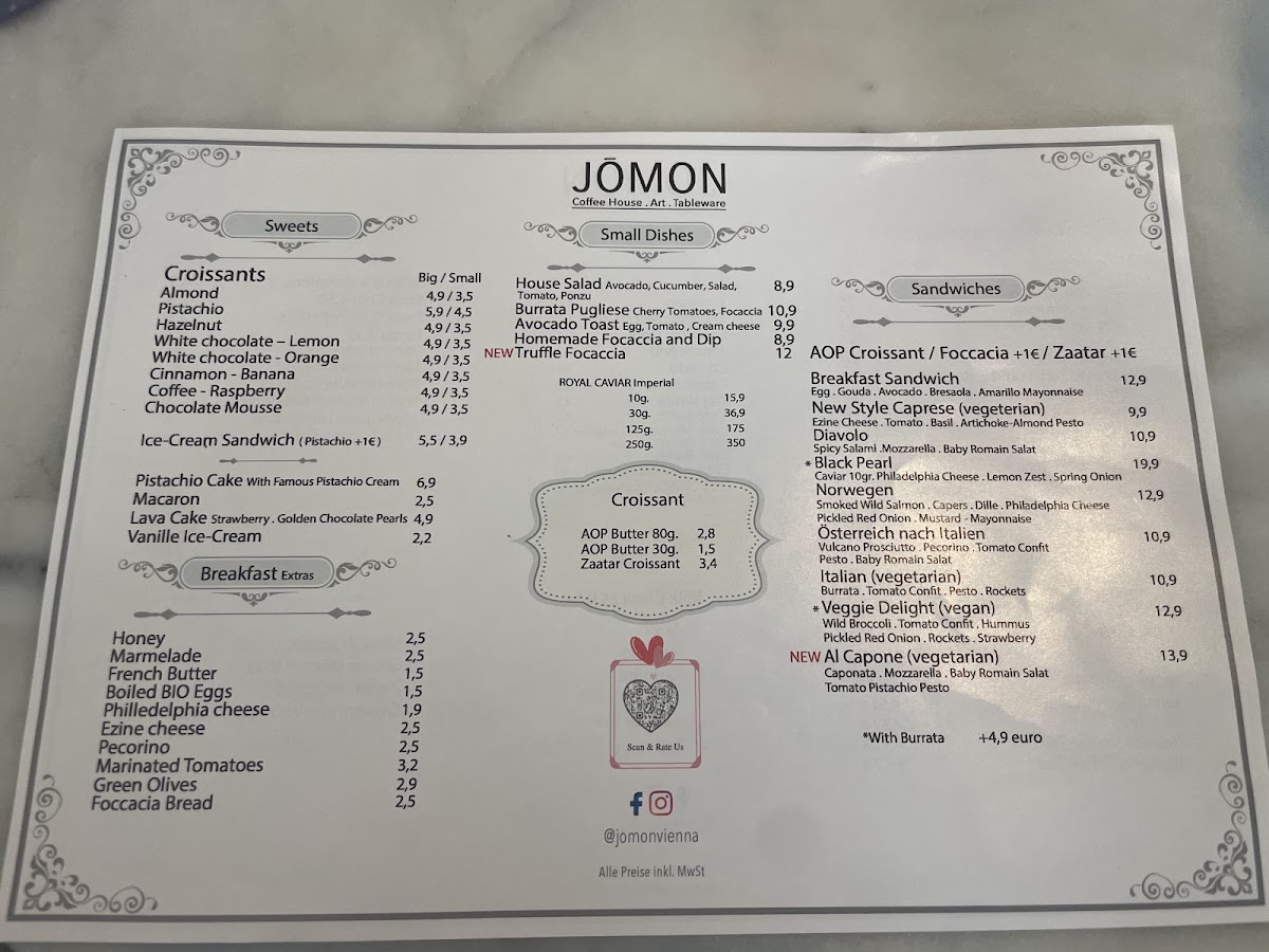 Welcome to JOMON, a delightful art café nestled in the heart of Vienna at Webgasse 3/2. Here, culinary creativity meets artistic ambiance, making every visit a feast for the senses. The menu is a vibrant fusion of flavors and artistry, with standout offerings like the Diavolo Sandwich, featuring spicy salami and fresh greens for €13.90, and the luxurious Black Pearl Kaviar for €23.90 that embodies indulgence.